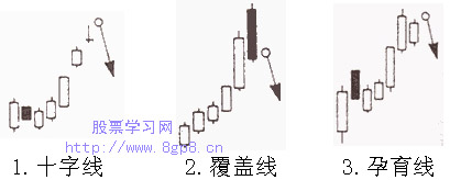 如何看K线图之卖出信号(图)(1) 收集:中国股票市场经济分析网 1、十字线 在高价圈出现十字线(开盘收盘等价线),并留下上下影线,其中上影线较长。此情形表示股票价格经过一段时日后,已涨得相当高,欲振乏力,开始要走下坡,这是明显的卖出信号。 2、覆盖线 行情连续数天扬升之后,隔日以高盘开出,随后买盘不愿追高,大势持续滑落,收盘价跌至前一日阳线之内。这是超买之后所形成的卖压涌现,获利了结盘大量抛出之故,将下跌。 3、孕育线 (阳线缩在较长的阳线之内) 连续数天扬升之后,隔天出现一根小阳线,并完全孕育在前日之大阳线之中,表示上升乏力,是暴跌的前兆。 【发表评论】【加入收藏】【告诉好友】【打印此文】【关闭窗口】 相关内容 上一篇教程: 如何看K线图之卖出信号(图)(3) 下一篇教程: 如何看K线图之买进信号(图)(7)