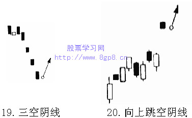 如何看K线图之买进信号(图)(7) 收集:中国股票市场经济分析网 19、三空阴线 当行情出现连续三条跳空下降阴线,则为强烈的买进信号,行情即将反弹。 20、向上跳空阴线 此图形虽不代表大行情出现,但约可持续七天左右的涨势,为买进时机。 【发表评论】【加入收藏】【告诉好友】【打印此文】【关闭窗口】 相关内容 上一篇教程: 如何看K线图之卖出信号(图)(1) 下一篇教程: 如何看K线图之买进信号(图)(6)