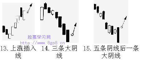 如何看K线图之买进信号(图)(5) 收集:中国股票市场经济分析网 13、上涨插入线 在行情震荡走高之际,出现覆盖阴线的隔日,拉出一条下降阳线,这是短期的回档,行情上涨。 14、三条大阴线 在下跌行情中出现三条连续大阴线,是行情陷入谷底的征兆,行情将转为卖盘,价格上扬。 15、五条阴线后一条大阴线 当阴阳交错拉出五条阴线后,出现一条长长的大阴线,可判断“已到底部”,如果隔日高开,即可视为反弹的开始。 【发表评论】【加入收藏】【告诉好友】【打印此文】【关闭窗口】 相关内容 上一篇教程: 如何看K线图之买进信号(图)(6) 下一篇教程: 如何看K线图之买进信号(图)(4)