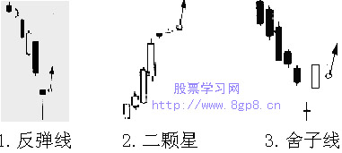如何看K线图之买进信号(图)(1) 收集:中国股票市场经济分析网 1、反弹线 在底价圈内,行情出现长长的下影线时,往往即为买进时机,出现买进信号之后,投资人即可买进,或为了安全起见,可等候行情反弹回升之后再买进,若无重大利空出现,行情必定反弹。 2、二颗星 上涨行情中出现极线的情形即称为二颗星、三颗星,此时价格上涨若再配合成交量放大,即为可信度极高的买进时机,价格必再出现另一波涨升行情。 3、舍子线 在大跌行情中,跳空出现十字线,这暗示着筑底已经完成,为反弹之征兆。 【发表评论】【加入收藏】【告诉好友】【打印此文】【关闭窗口】 相关内容 上一篇教程: 如何看K线图之买进信号(图)(2) 下一篇教程: 如何看K线图之卖出信号(图)(2)