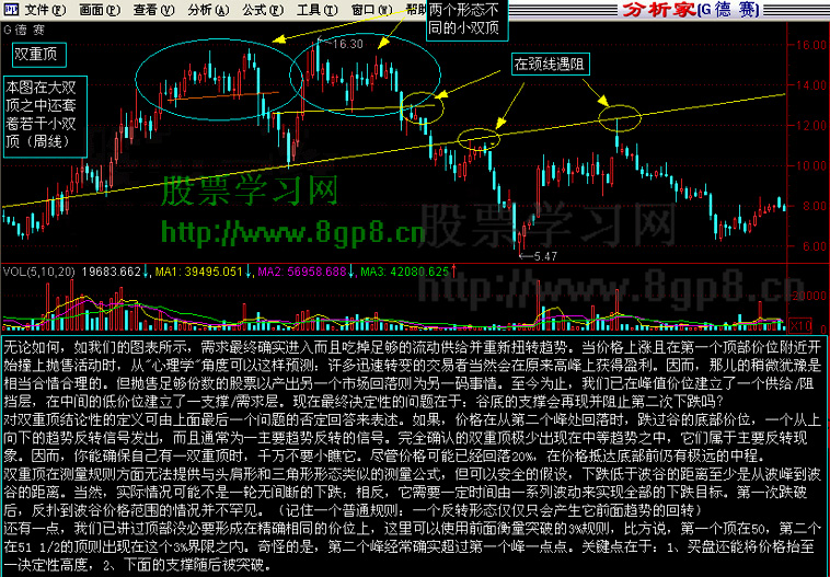 1.型态分析 一只股票上升到某一价格水平时,出现大成交量,股价随之下跌,成交量减少。接着股价又升至与前一个价格几乎相等之顶点,成交量再随之增加却不能达到上一个高峰的成交量,再第二次下跌,股价的移动轨迹就象M字。这就是双重顶,又称M头走势