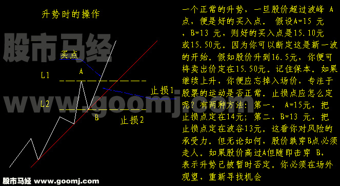 K线操作图解:升势时的操作 收集:中国股票市场经济分析网 假如这是一个正常的升势,A、B点分别是波峰和波谷。一旦股价超过A点,便是好的买入点。假设A=15元,B=13元,则好的买入点是15.10元或15.50元。因为你可以断定这是新一波的开始。假如股价升到16.5元,你便可将卖出价定在15.50元。记住保本。如果继续上升,你便应忘掉入场价,专注于股票的运动是否正常。 【发表评论】【加入收藏】【告诉好友】【打印此文】【关闭窗口】 相关内容 上一篇教程: K线操作图解:牛股的攻击信号 下一篇教程: 股票K线图形:旗形之二