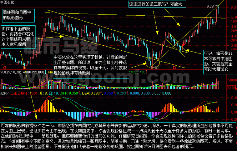 2、形态完成后成交量必须剧增,即不论是向上或向下突破时,成交量均有激增。向上突破时放量容易理解,向下破位时放量其原因在于,由于旗形整理的周期相当短,卖压来不及消化,因此股价再度向下破位时将招致恐慌性抛盘的涌出。一汽轿车在4月28日以涨停板再拉旗杆从而结束上升旗形的整理,成交量也再次放大。