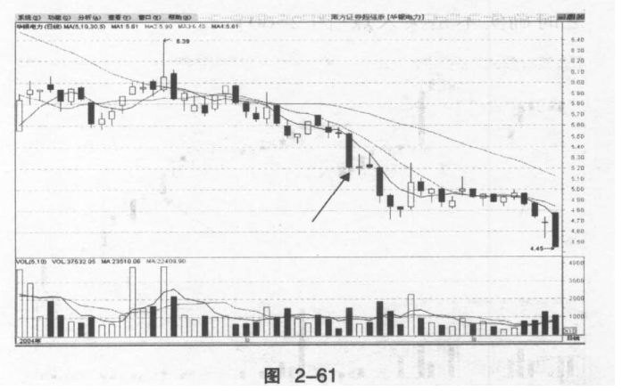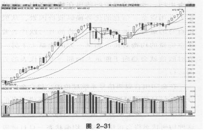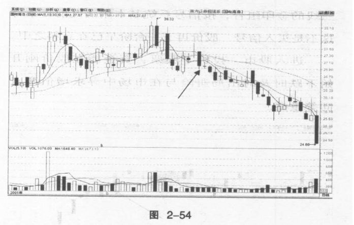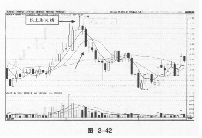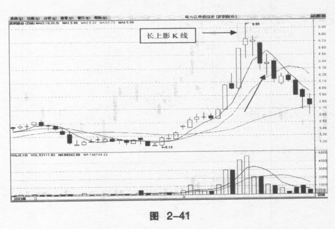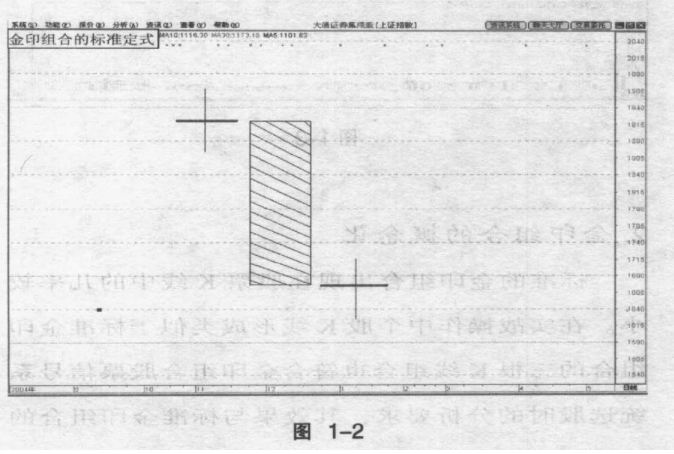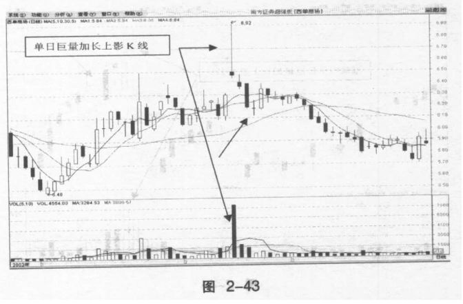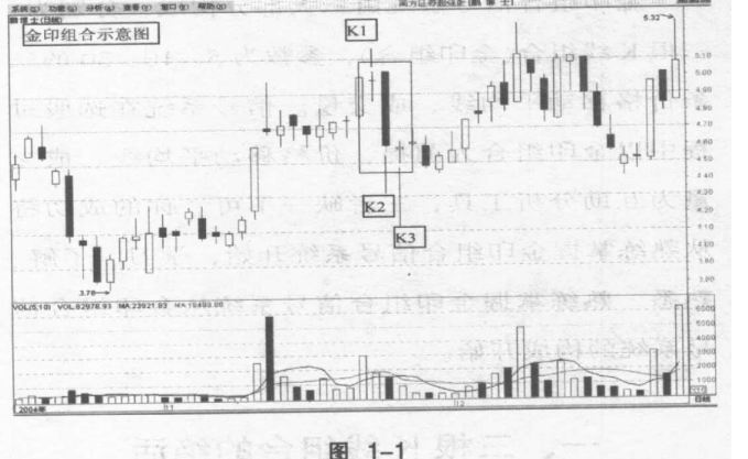 七、股价波段升幅较大,在相对高位入出巨量或收长上影K线时形成金印组合——不是买入信号,切勿介入。(如下图)