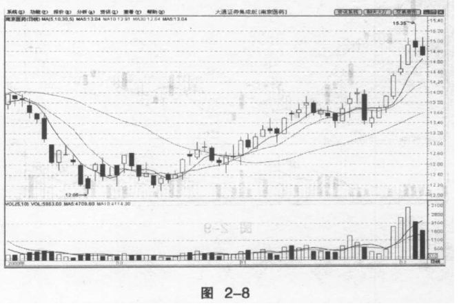 八、股价前期历经一波较大的升幅,现时正在相对高位强势横盘振荡。5、10均线随着股价的波动上下交错横向运行,30均线积极向上攀升,在三条均线非常靠扰时,股价在30均线之上形成缩量的金印组合——买入信号。(如下图)