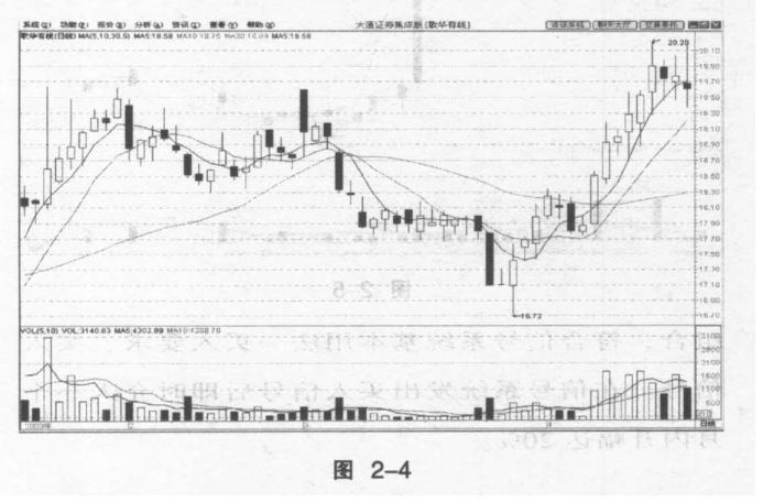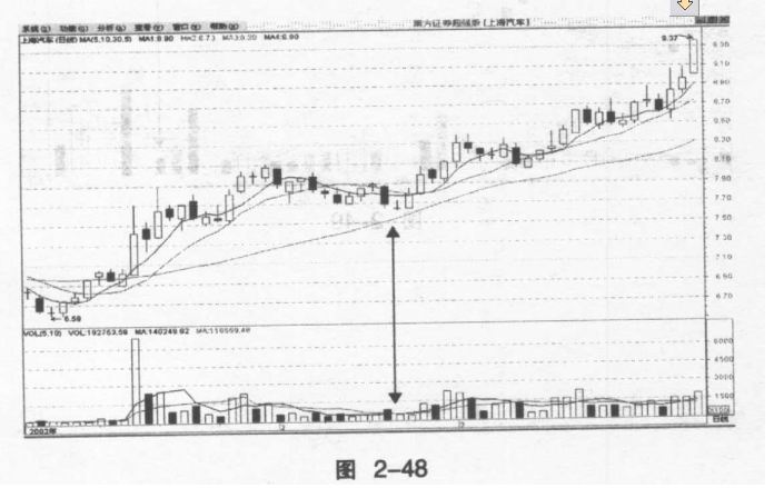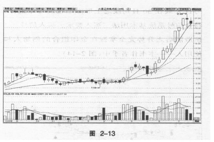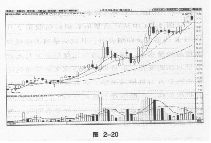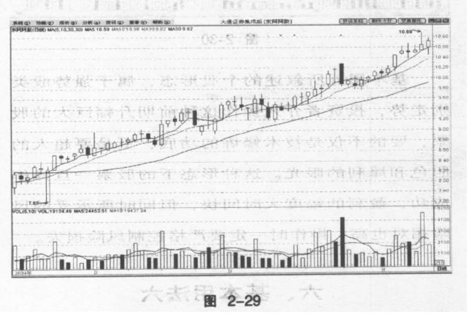 五、5、10、30均线金叉后向上大幅发散,股价以5或10均线为回调支撑强势上扬,巨大升幅后股价回落在10均线之上形成缩量的金印组合——买入信号。(如下图)