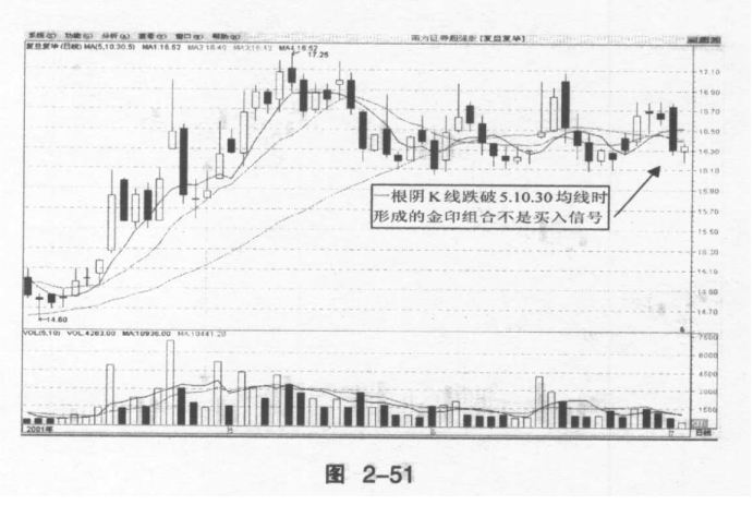 九、一根阴K线跌跛三条均线(5、10、30)时形成的金印组合——不是买入信号,切勿介入。(如下图)