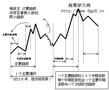 即从大的角度来看的上涨和下跌的变动。其中,只要下一个上涨的水准超过前一个高点。而每一个次级的下跌其波底都较前一个下跌的波底高,那么,主要趋势是上升的。这被称为多头市场。相反地,当每一个中级下跌将价位带至更低的水准,而接着的弹升不能将价位带至前面弹升的高点,主要趋势是下跌的,这称之为空头市场。通常(至少理论上以此作为讨论的对象)主要趋势是长期投资人在三种趋势中唯一考虑的目标,其做法是在多头市场中尽早买进股票,只要他可以确定多头市场已经开始发动了,一直持有到确定空头市场已经形成了。对于所有在整个大趋势中的次级下跌和短期变动,他们是不会去理会的。当然,对于那些作经常性交易的人来说,次级变动是非常重要的机会。