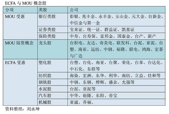 投资法人指出,两岸股市中的MOU、ECFA概念股,在ECFA实施前都将持续有所表现,但投资海西概念股时,还是要思索一下到底是实际受益股还是纯粹炒作。